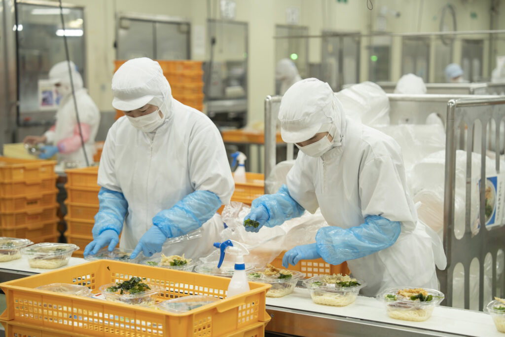コンベアベルトラインでの盛り付け作業
