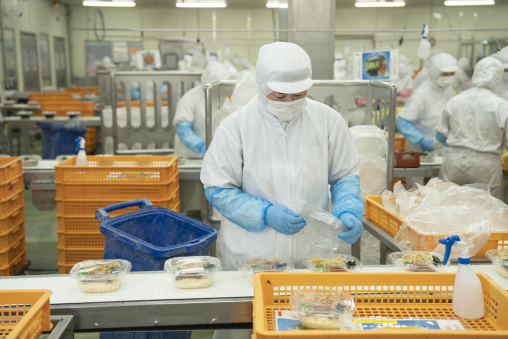 「麺はかり」は、パスタや焼きそばなどの商品製造で、決められた麺の量を計量器で量り、容器に入れる作業です。盛り付けの最初の工程を担当するため、ライン全体の流れをスムーズにする大切な役割を担います。一定のリズムで盛り付けを進めながら、蓋をかぶせる作業も行います。