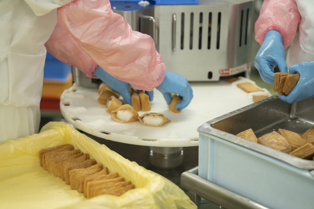 ライン作業の中で最も難しいのが「帯(帯状の包装)」の工程です。盛り付け・蓋付けが終わった製品が流れてきた後に行う、最後の作業になります。平らな帯を丸く広げ、その中に製品を通す作業で、熟練者が担当する高度な工程です。