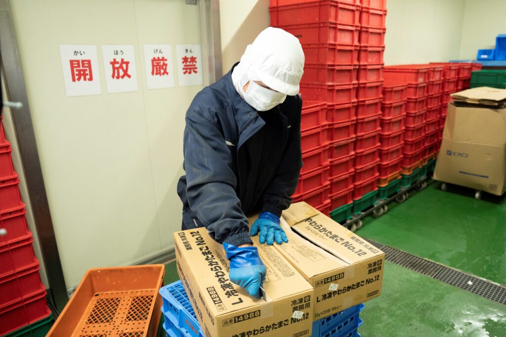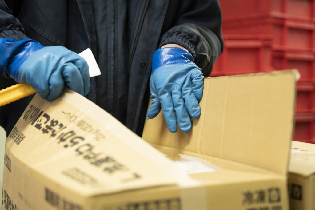 段ボールから原材料を取り出し、入荷日が分かるようにシールを貼ります。