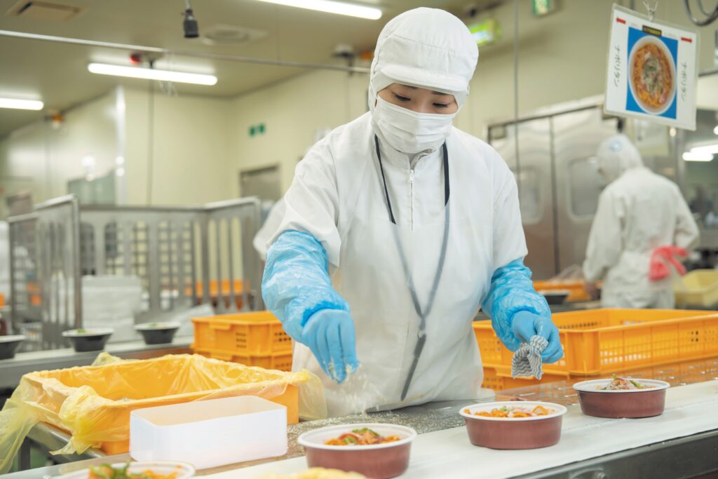 最初は手に取りやすい個包装の食材など、シンプルな盛り付け作業からスタートします。作業に慣れながら少しずつステップアップしていけます。